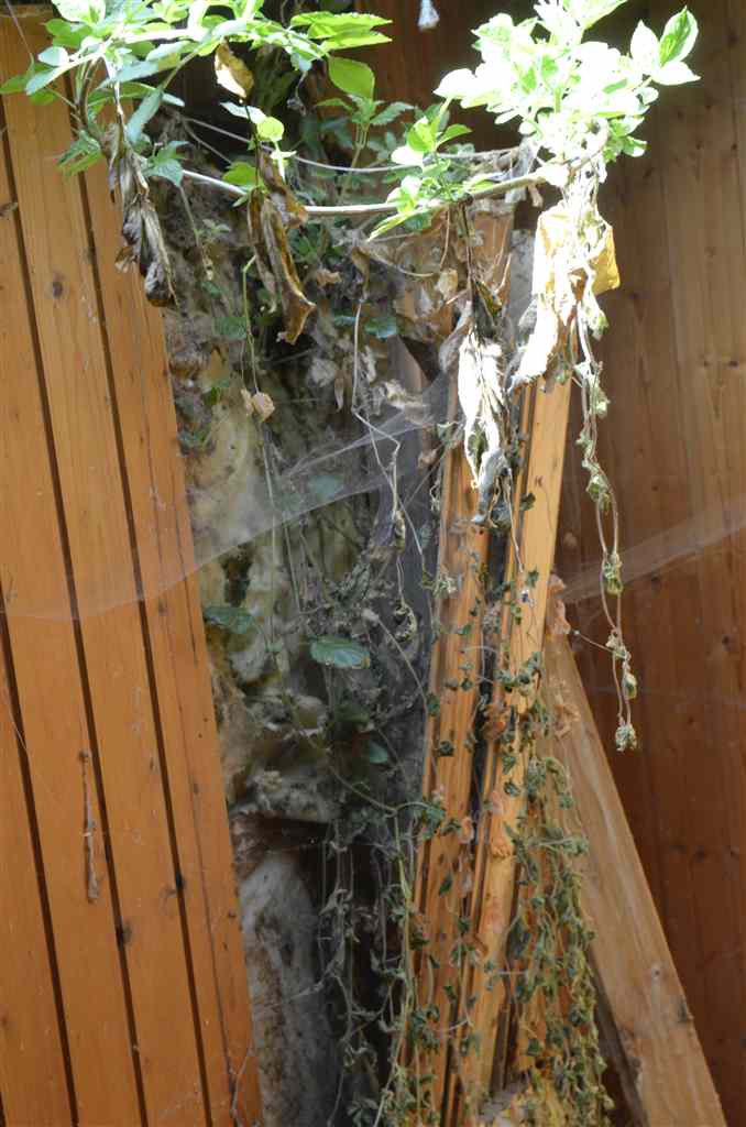 ich habe noch 3 bilder von meinem haus angehängt. diese stand 25 jahre leer. ein kleinstes leck (in diesem fall tatsächlich in der gespenglerten einfassung des dachfensters) hat in der zeit einen beachtlichen teil des dachstocks, der zwischendecke aufgelöst und in der dämmung hat sich ein hollunder eingenistet. wir haben dann die gesamte dämmung entfernt und das dach provisorisch mit einer folie abgedeckt. das war in einem tag erledigt. nun kann alles trocknen und der schaden wird nicht grösser.