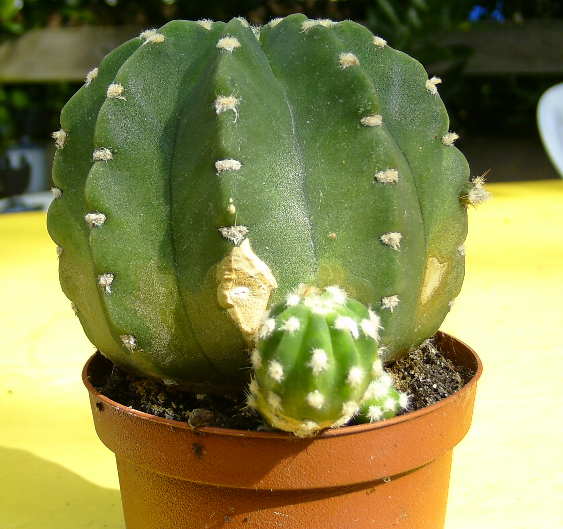 An der Schnittstelle im ersten Bild habe ich einen Ableger abgeschnitten und bewurzeln lassen. Man sieht dass auch aus der Erde neue Kakteen wachsen. Ein weiterer bildet sich gerade an der rechten Rippe.