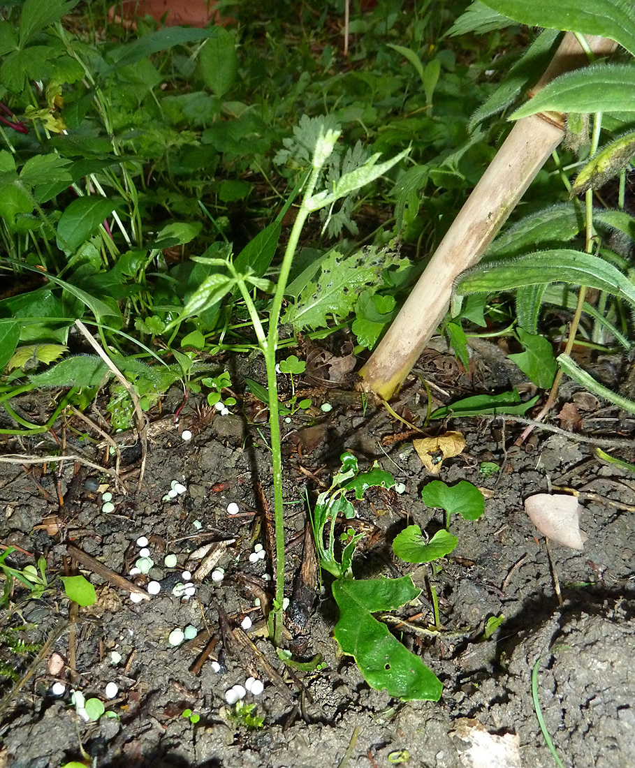 Man, was habe ich diese ausgegrabene Bohne gepäppelt! Die hellen Körner drumherum sind Dünger. Aufgenommen wurde sie heute Abend mit Blitz.