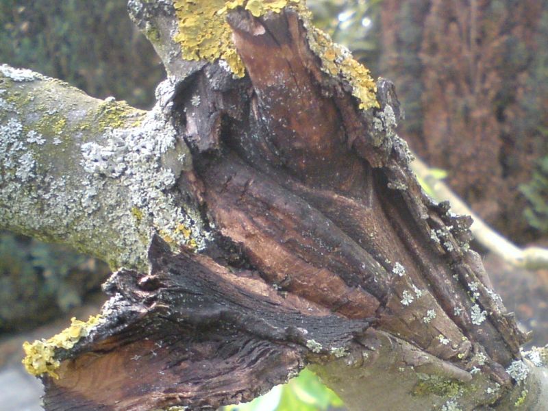 Ich glaube aber hier auf dem Bild ist die Rede von der abgeplätterten Rinde. Das ist gaaaanz schlecht. Wir haben unseren Apfelbaum deswegen abholzen müssen weil er dadurch gestorben ist. Die Rinde ist der einzige Schutz bei Bäumen. Du kannst es wie wir versuchen die Wunde zu verschließen, aber große Hoffnungen will ich Dir nicht machen.