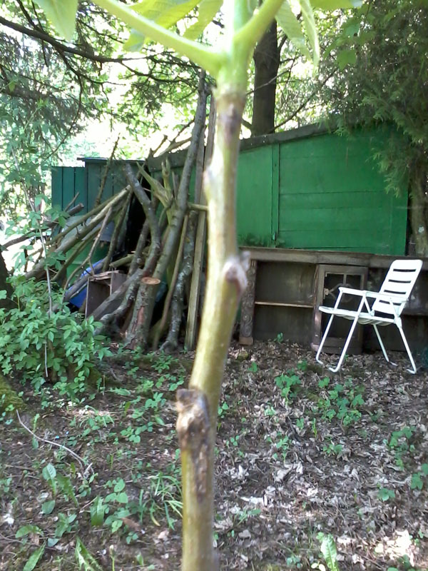 Schnelles kleines Update: Das Walnüsschen steht erstmal im Topf unter Beobachtung. Der Pflanzenversand hat zugesagt, ihn zurückzunehmen, falls er kränker wird, aber gebeten, erstmal abzuwarten. Dachte, das kann ich ja ruhig tun. Schlimmer ist es an den Trieben nicht geworden, aber eine Blattrispe hat er abgeworfen, nachdem deren Blätter zunächst einige Tage schlapp hingen. Die hat auch ne gräuliche Verfärbung. Leider haben wir inzwischen ne Beziehung miteinander ;-), das Rücksenden wird also nicht leicht werden. Also hoffe ich, dass er gesundet. Trotz Dauerregen.