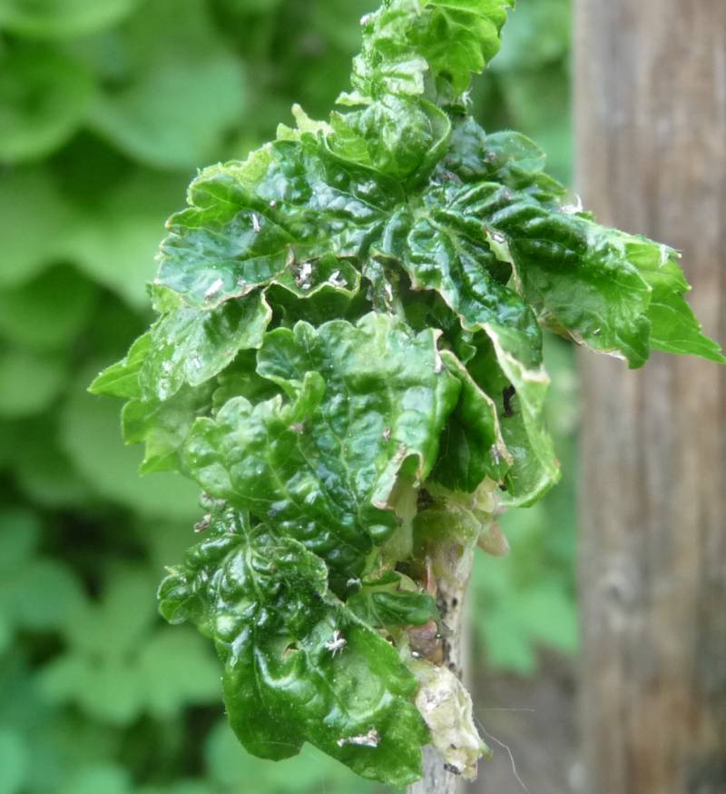 Es gibt auch eine Johannisbeerblasenlaus, deren Symptome sind aber anders. Und die Kräuselkrankheit vom Pfirsich kann sie nicht haben, obwohl es ähnlich aussieht.