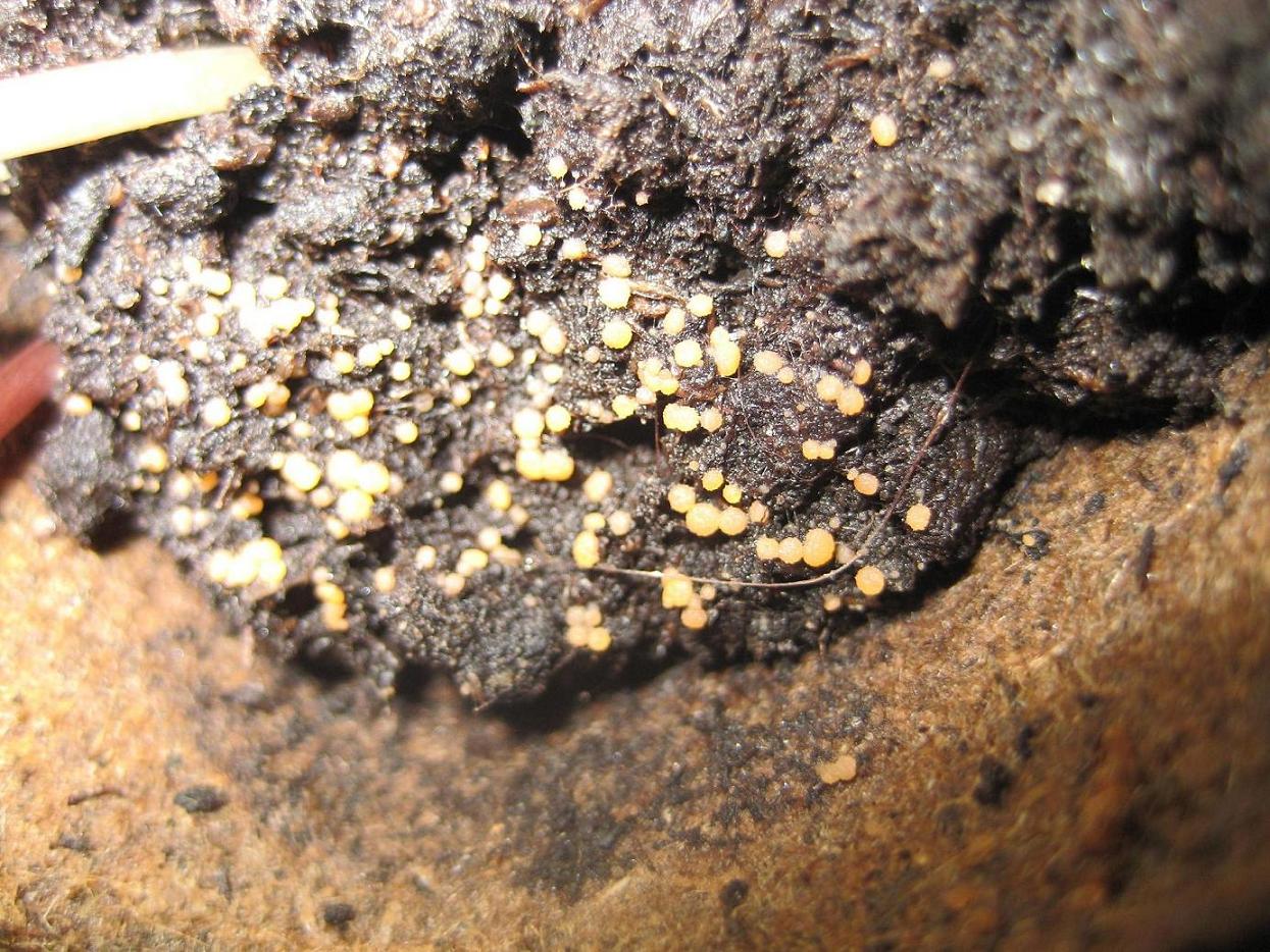 Als ich heute gießen wollte habe auch auf fast jeden Töpfchen kleine rosa-gelbliche Eier gesehen, innen auf der Erde sowie