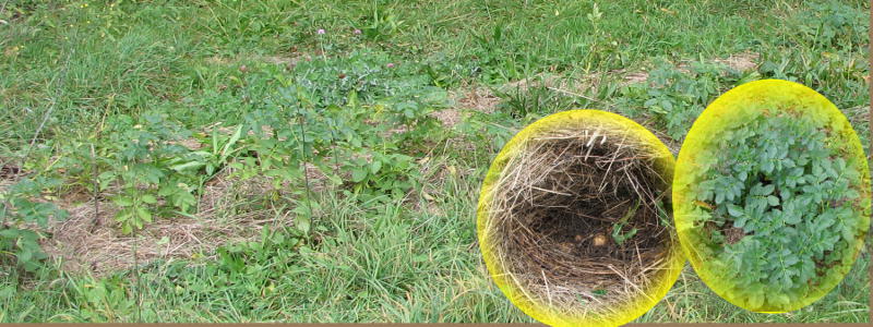 Hier sieht man, dass sich die Kartoffeln halb eingegraben haben. Die Größe der Kartoffeln ist nicht abhängig von der Methode, sondern hier von einem zu späten Zeitpunkt des Setzens