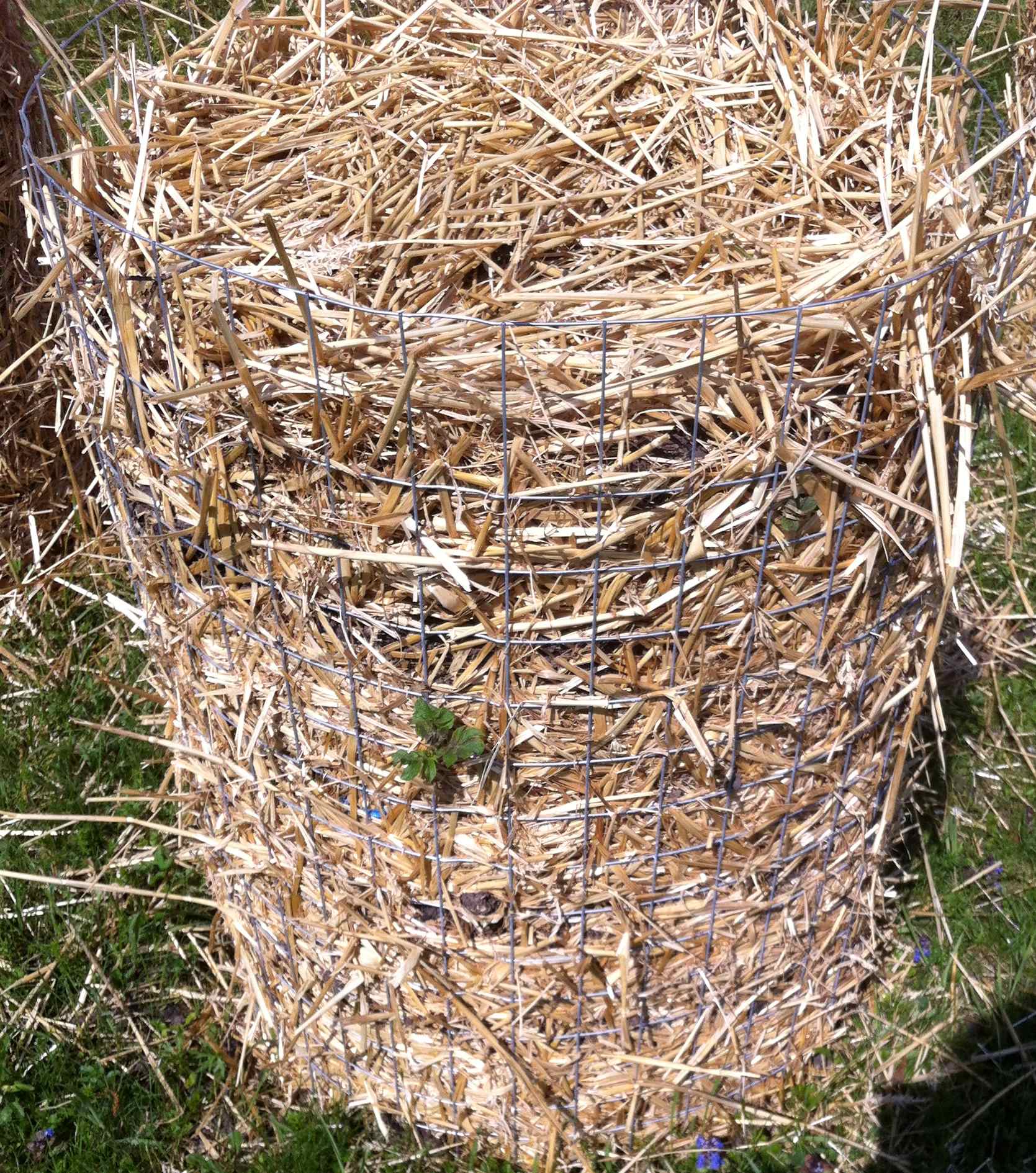 Mit Stroh habe ich dafür gesorgt, dass die Erde nicht herausrieselt und dann den Turm schichtweise befüllt: Kartoffeln->Heu->Hornspähne->Erde->nächste Schicht.