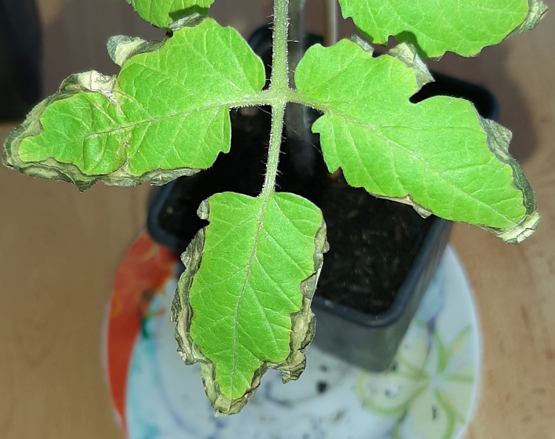 Die Tomatenpflanzen sind gut gewachsen, die oberen Blätter sind dunkelgrün, die unteren werden nun hell und an den Blattspitzen werden sie erst dunkel, dann vertrocknen sie.