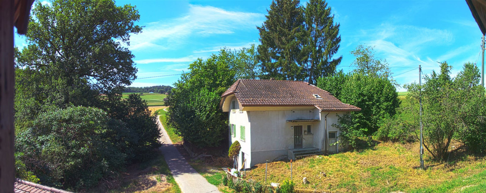 Links im Bild befindet sich eine sehr grosse Eiche welche das Gebäude weit überragt. (Der Stamm hat geschätzte 100cm Duchmesser)