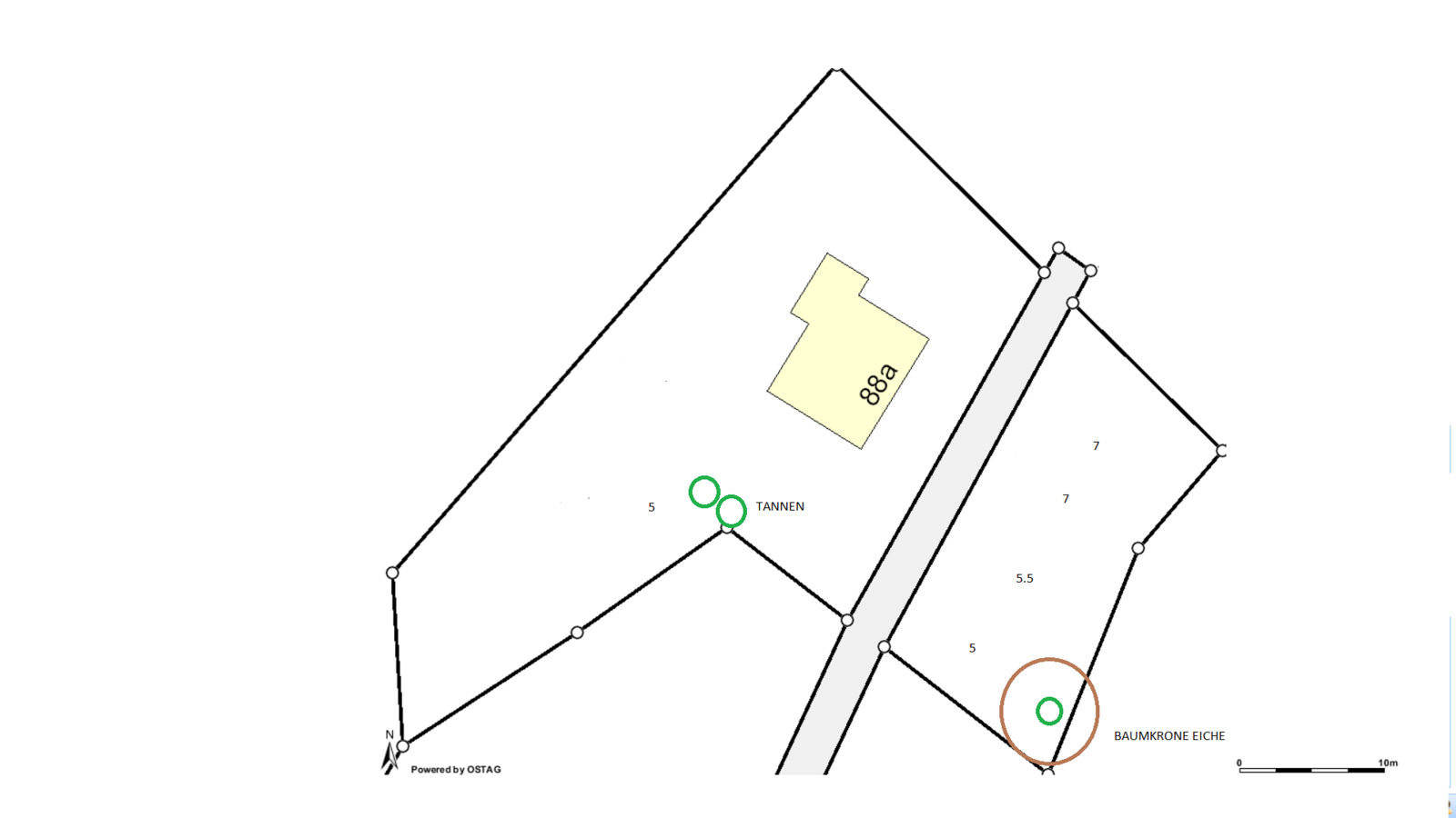 leider leider wurde der restliche teil des östlichen teils des grundstückes, dem mit der eiche, ziemlich havariert. (ohne unser wissen) dort befindet sich nun aushub aus bis zu 2 meter tiefe und es ist an zu nehmen, dass der nicht viel abgibt.... (braun eingezeichnet)....