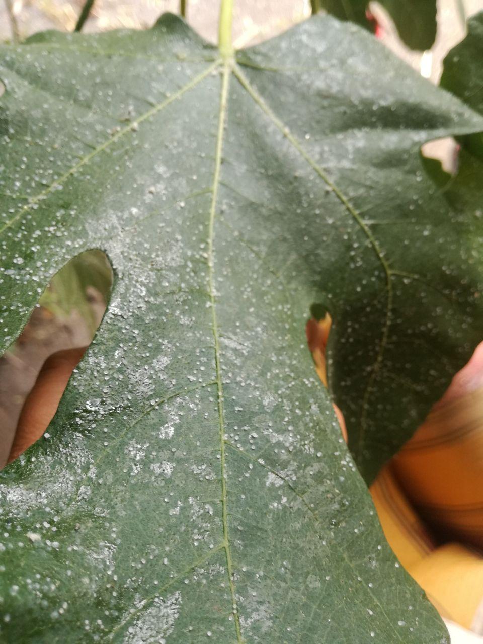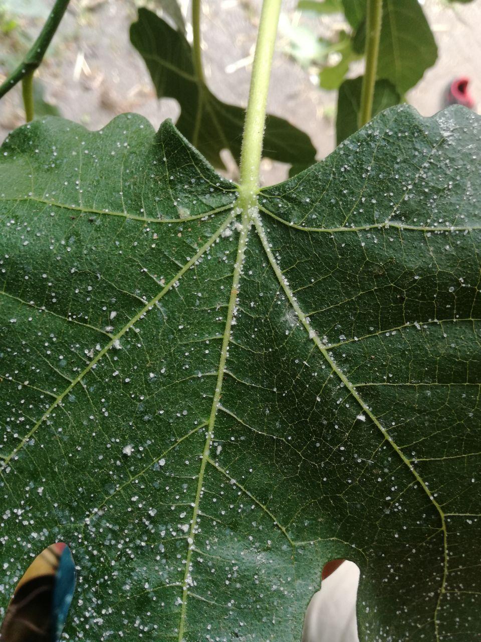 Unser Feigenbaum ist seit einigen Wochen von kleinen weißen Objekten übersät, die zuerst an Kristalle wie von Zucker oder Salz erinnern, genauer untersucht aber rund und klebrig sind. Sie lassen sich zu Gel zerdrücken und schmecken leicht süßlich. Auf alle Blättern des Baumes sind sie lose und unregelmäßig wie aufgestreut. Nach einiger Zeit werden sie zu klebrigen Flecken. Es rieselt konstant auf alles was unter dem Baum steht.