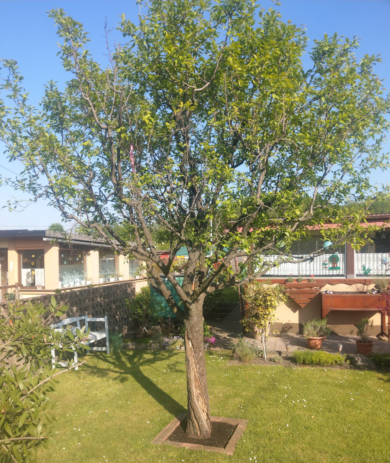 Dort steht ein Pflaumenbaum mit großen "Stammschaden".