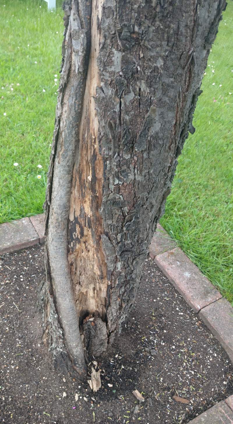 Oje, das ist ein viele Jahre alter, großer Frostriss, der nie behandelt wurde. :???: