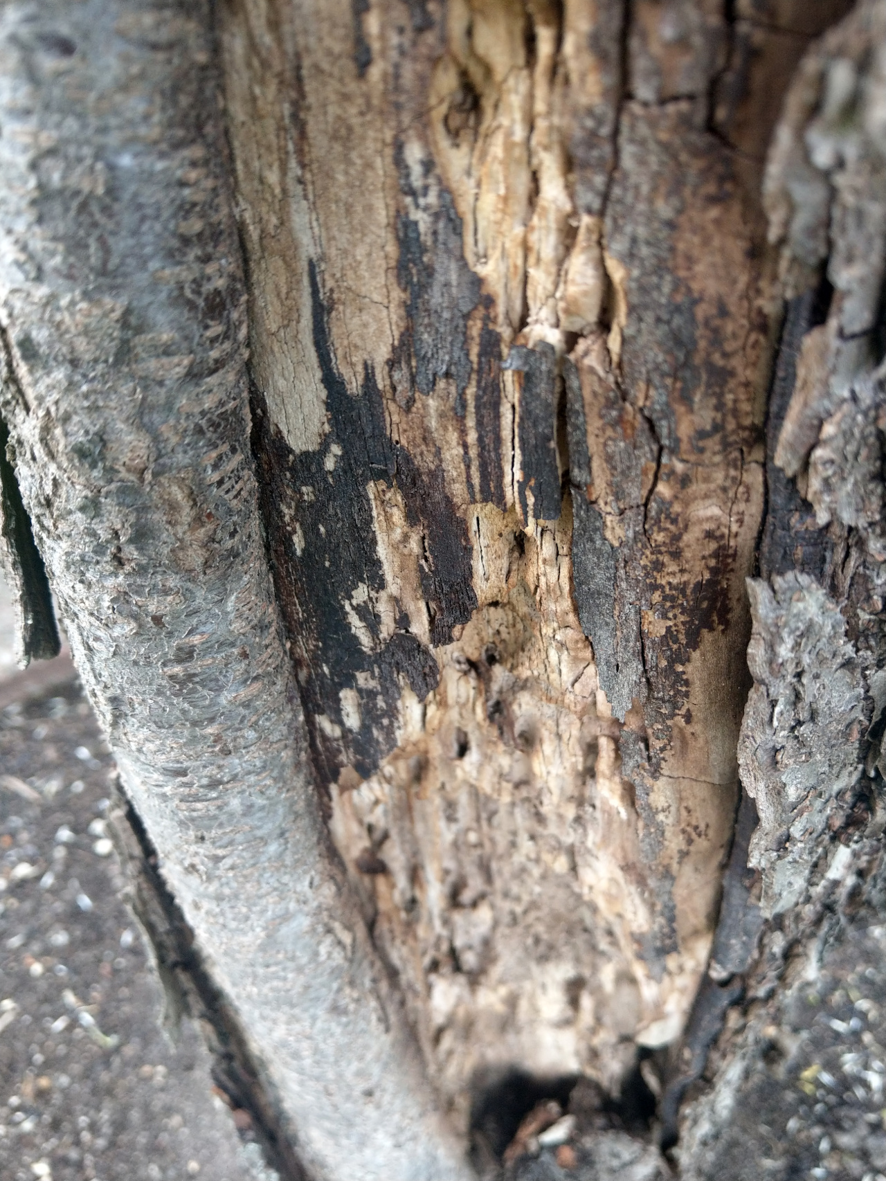 die obere Rinde ist komplett weggeplatzt und das Holz darunter läßt sich leicht wegkratzen wie morsch.
