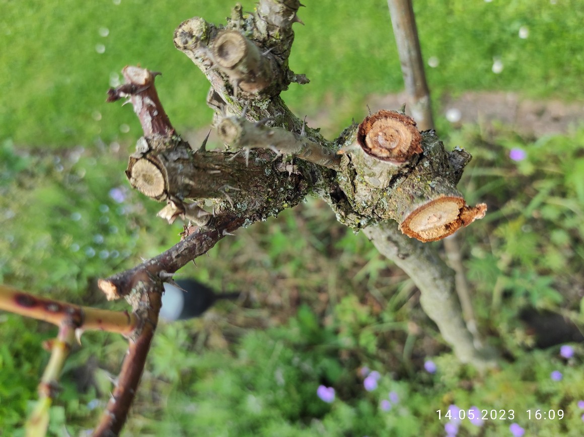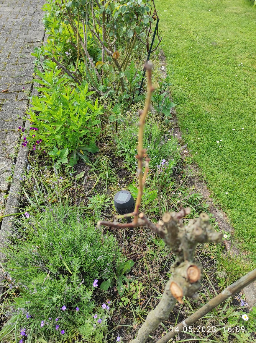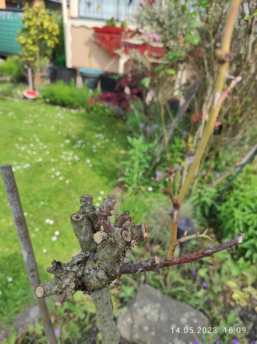 Das verbliebene Zweiglein wächst auch nicht gerade an einem kräftigen Zweig. Ich hätte jetzt wenig Hoffnung, dass es den nächsten Winter überlebt. Und dann daraus wieder ein ansehnliches Rosenbäumchen zu machen, dürfte Jahre dauern.