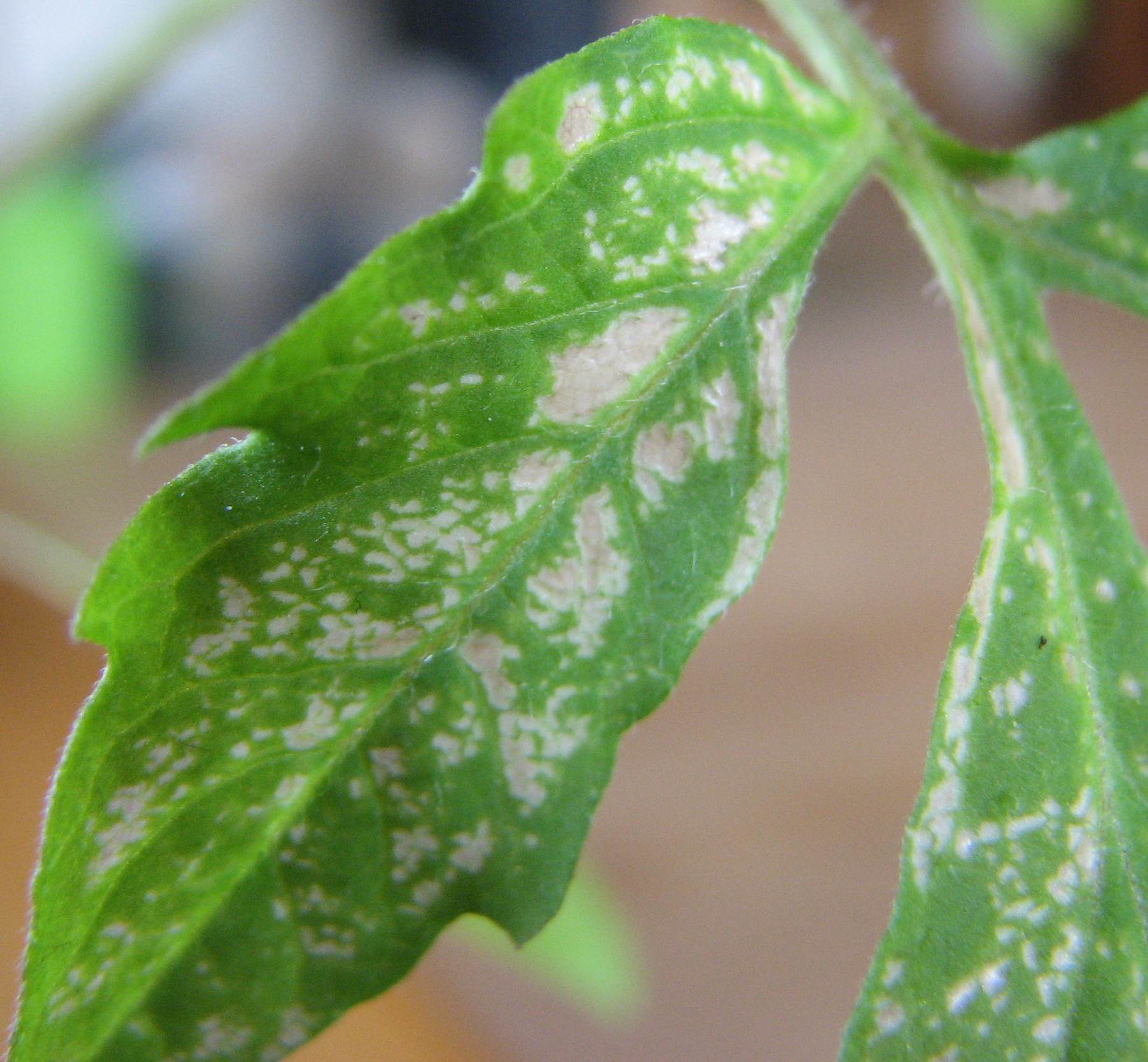 Alle meine Tomatensorten haben diese Veränderungen Wenn man die Flecken auf der Oberseite des Blattes mit der 10-fach Lupe anschaut, kann man erkennen, dass das Chlorophyll wie ausradiert oder auch weggelasert ist. Fährt man mit dem Finger dahinter herum, kann man die Bewegung des Fingers durch das pergamentarige Restgewebe erkennen.