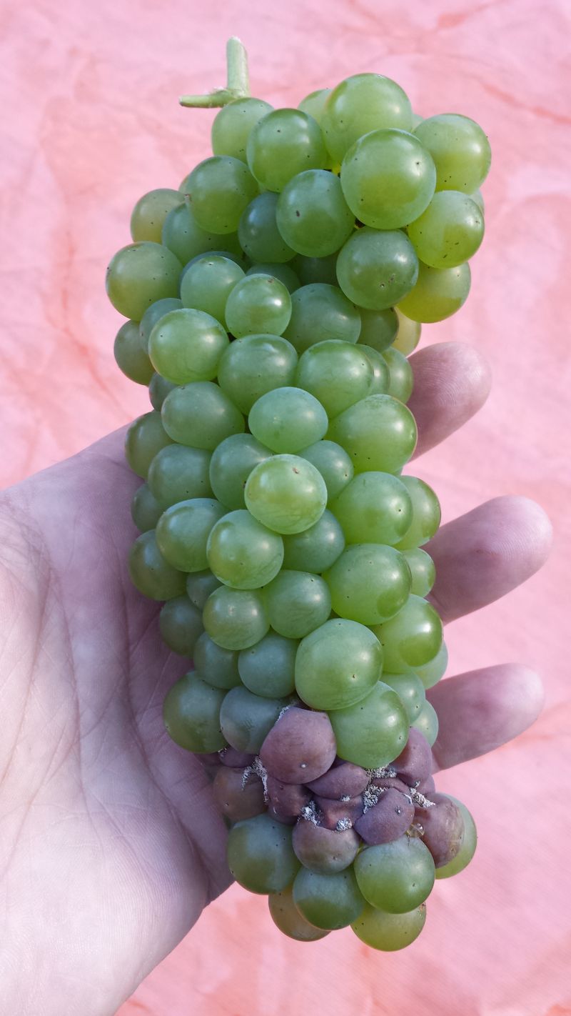 Da ich pro Trieb nur 2 Trauben belasse, ist der Ertrag ausgezeichnet, die Erkrankung aber sehr ärgerlich! Der Stock steht auf der Südseite und relativ trocken.
