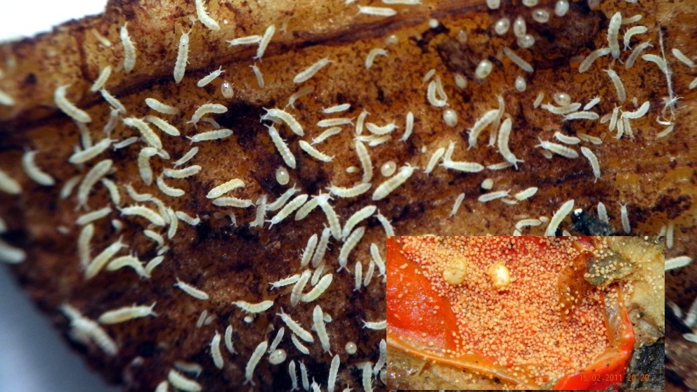 Auf einer Fläche von nur 6cm² Bananenschale/ Paprika sieht man hier viele Milben und Springschwänze, die genau das tun was wir alle suchen, sie produzieren wertvollen Humus.