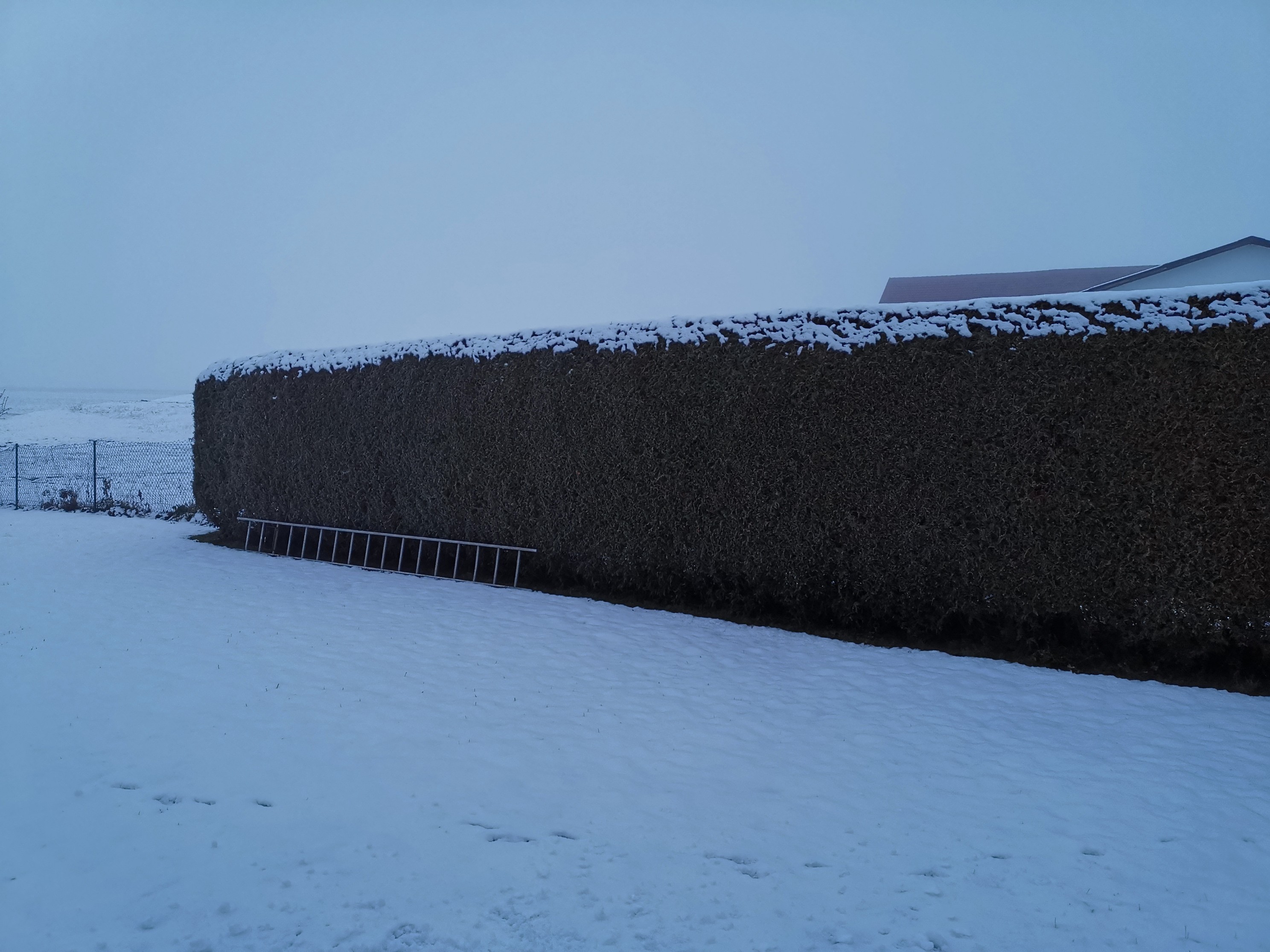 Außerdem steht vor der Hecke in der Regel unser ziemlich großes Trampolin. Das nimmt relativ viel Platz ein.