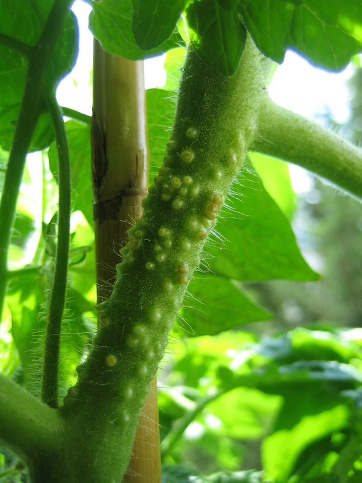 meine Buschtomate hat seit kurzem ganz viele kleine Pusteln am Stängel und es werden immer mehr.